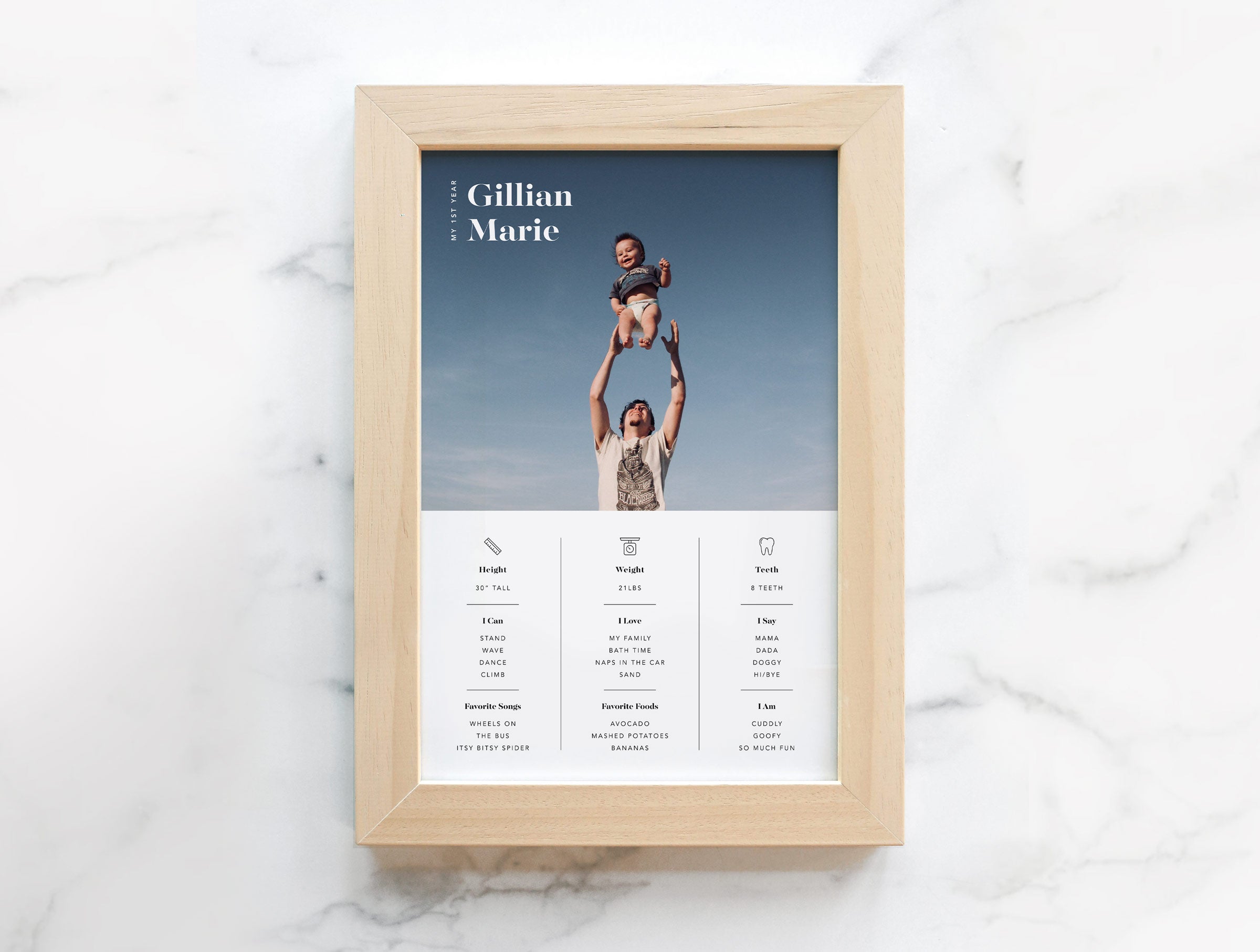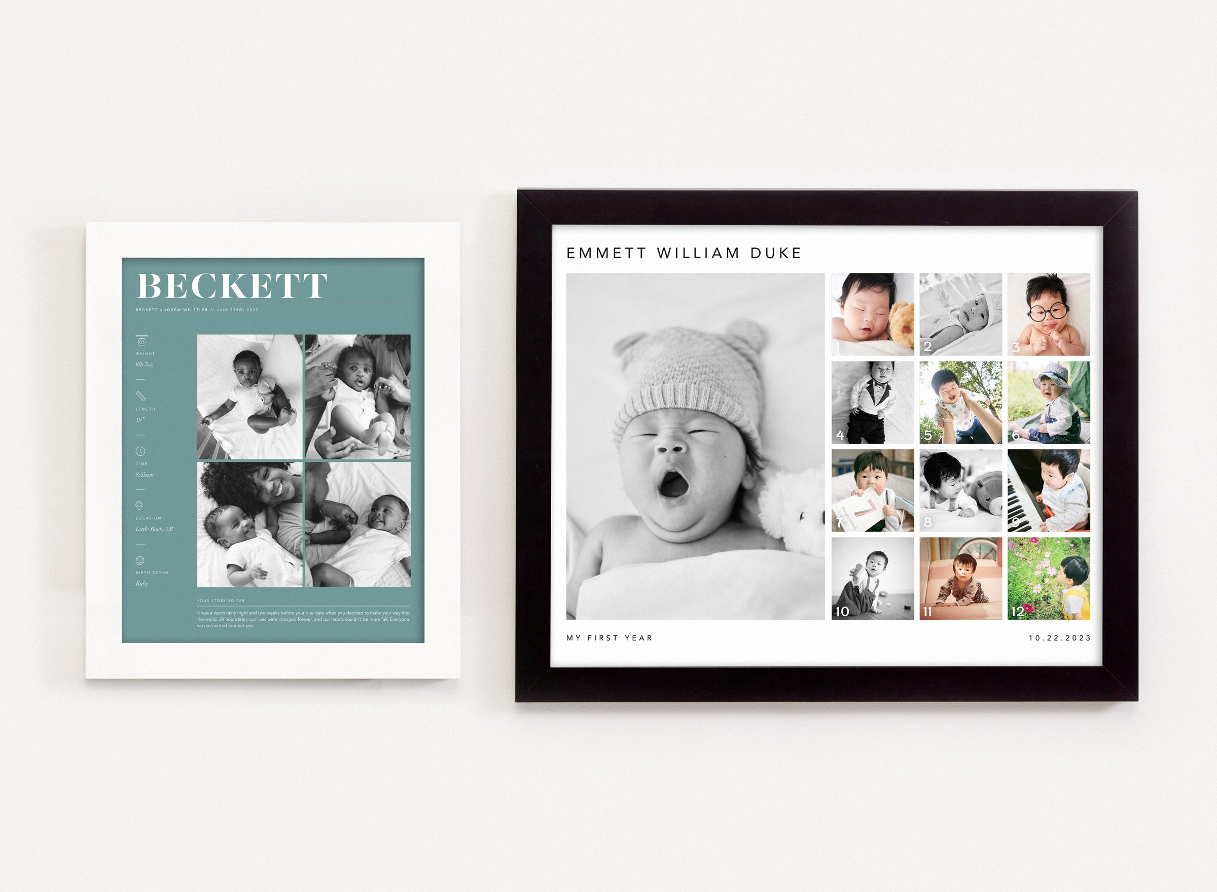 The first-year moments are fleeting, preserve them forever in a keepsake frame. Choose from birth stats, monthly photo grids, and more to turn your baby photos into a work of art.