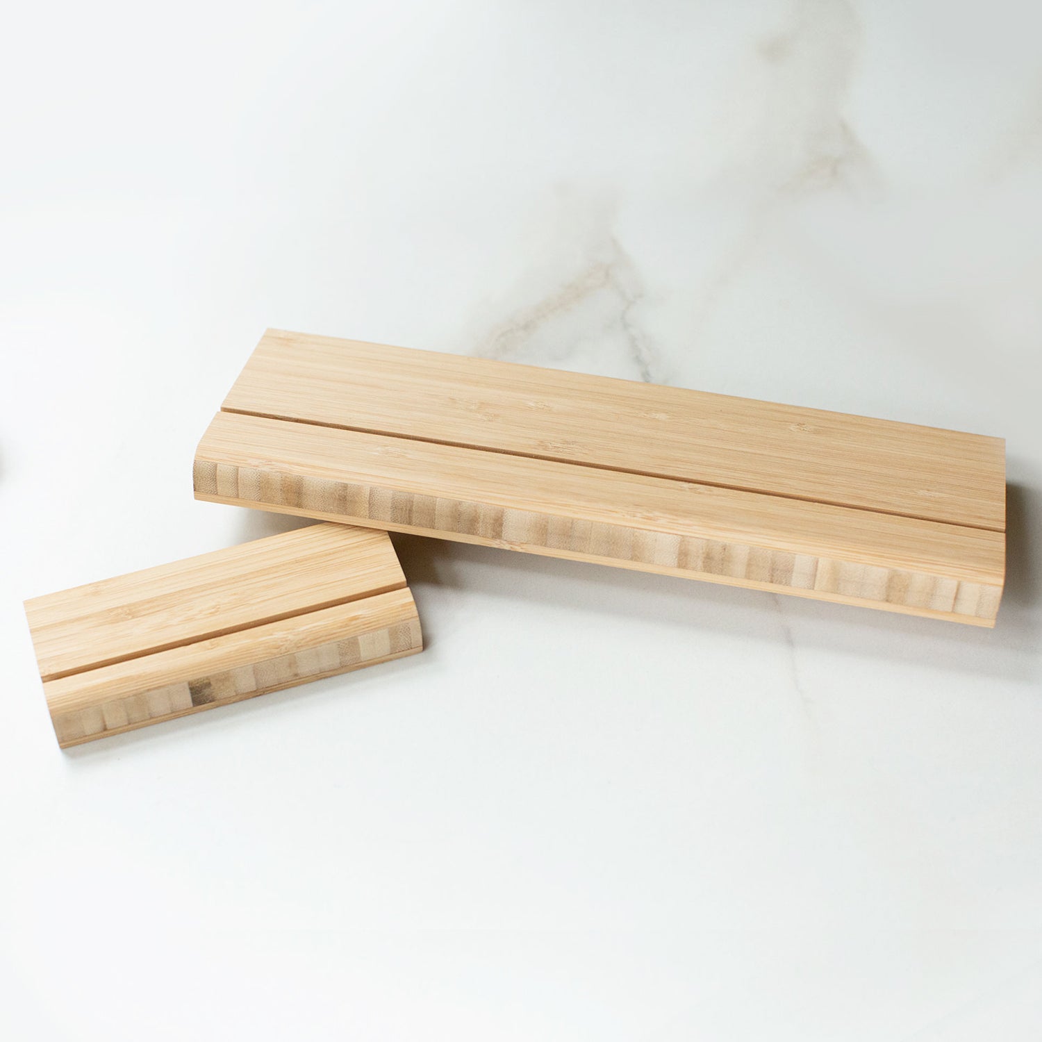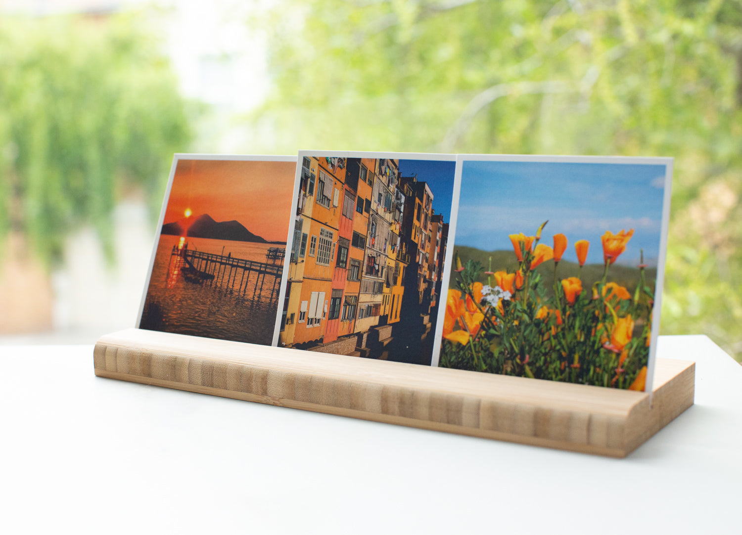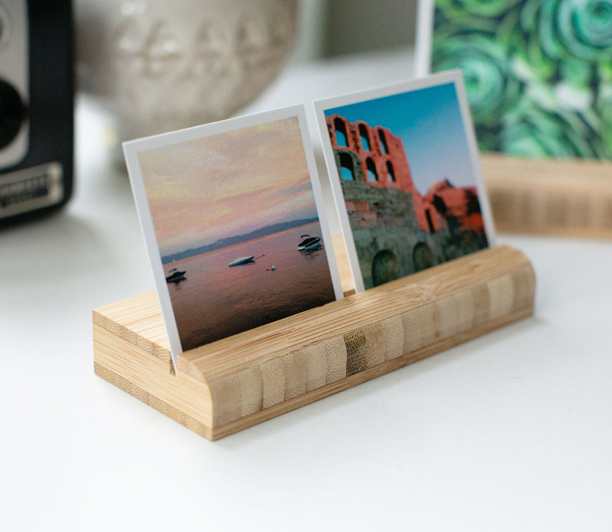 Dress up your desk with handmade bamboo photo display blocks. Just slide your print into the groove! Rotate prints any time for fresh decor. The small blocks are perfect for displaying a 4x4 Square Photo Print, while the large block leaves room for a whole family of prints, big or small.