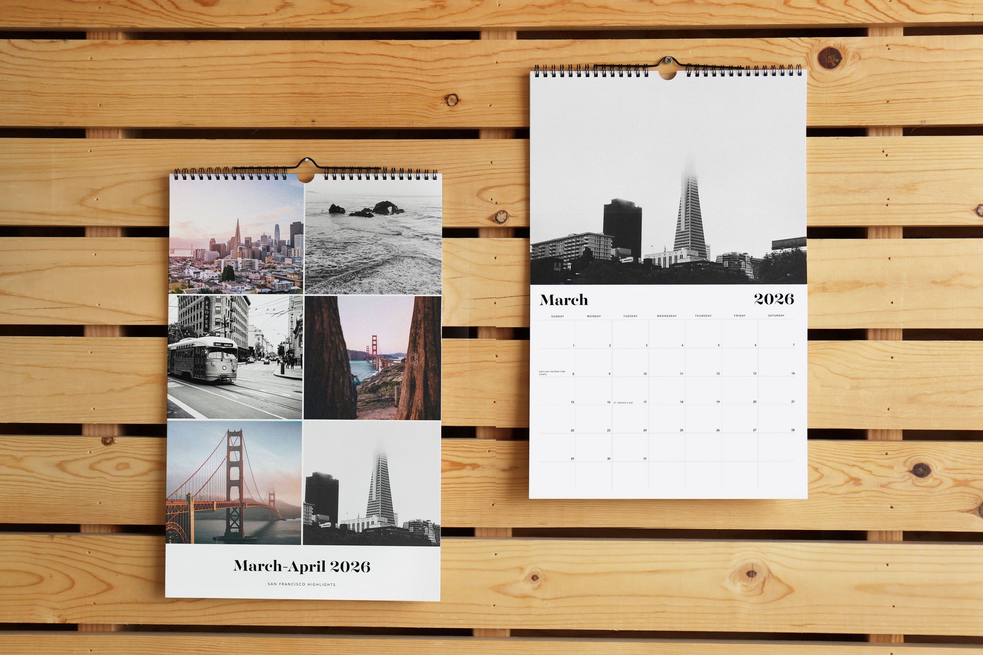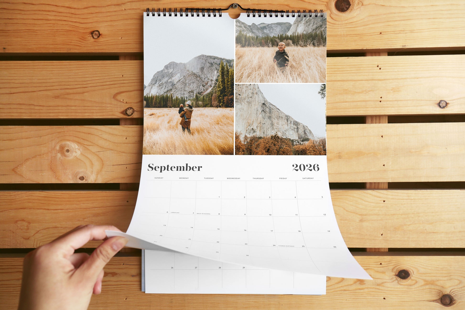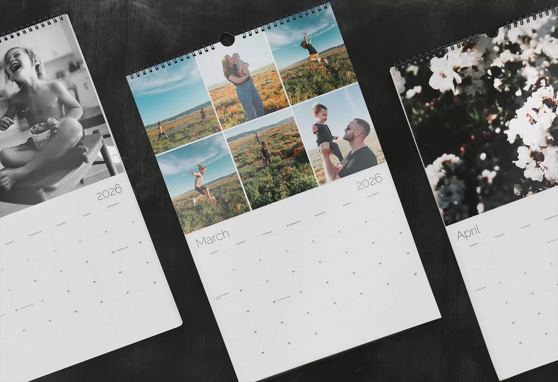 Create a custom calendar with your photos. Choose a unique photo layout for each page. Add your own holidays to mark birthdays and anniversaries. Printed on thick archival-quality paper with a smooth matte finish, then spiral-bound for hanging.