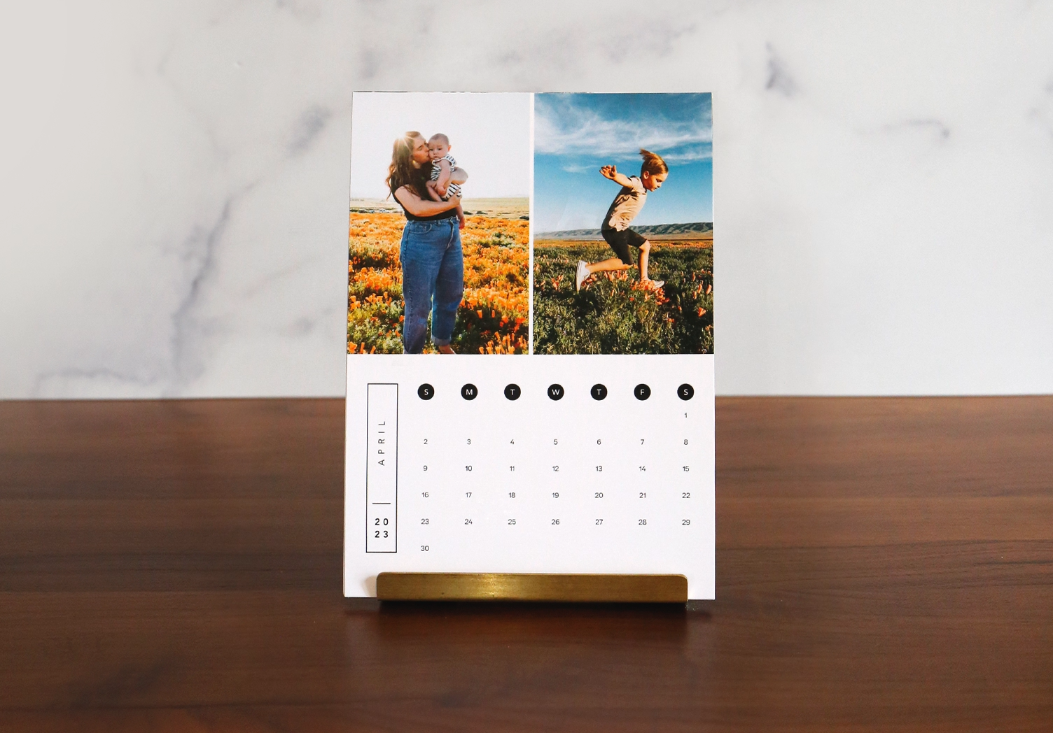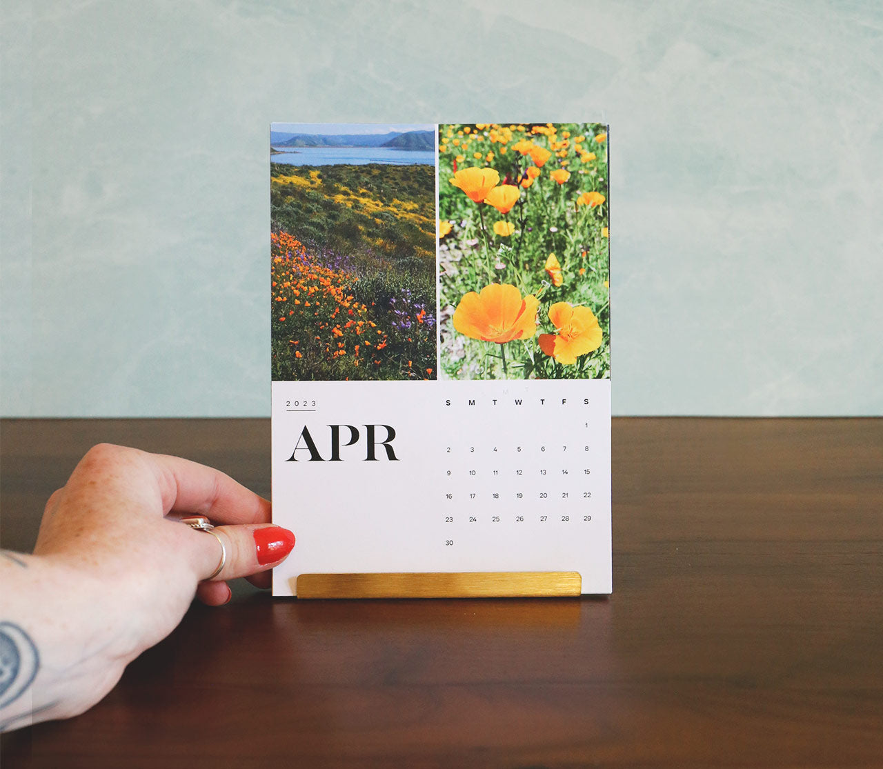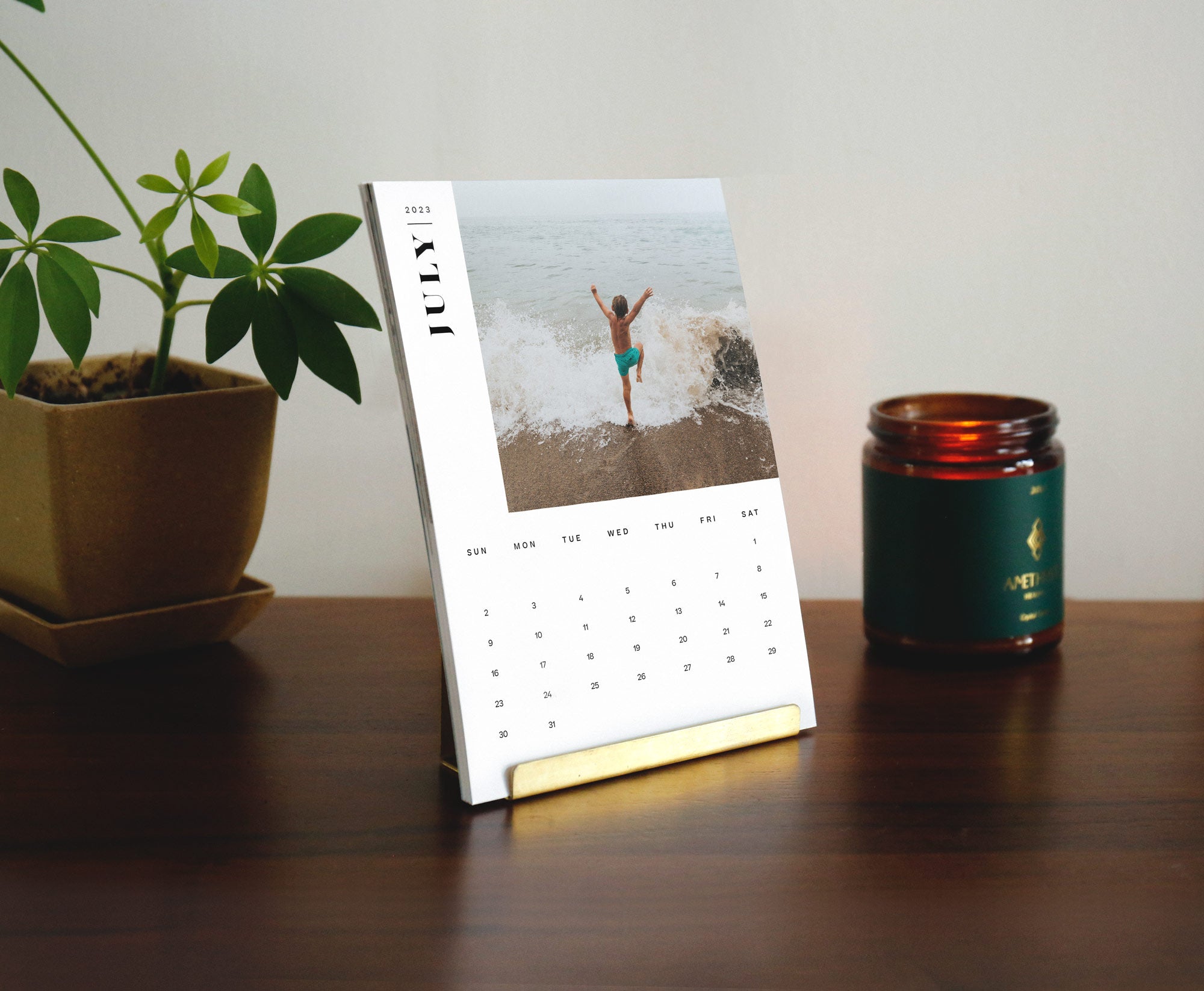 A custom desk calendar featuring archival-quality prints on a beautiful brass stand—perfect for gifting or up-leveling your own space.