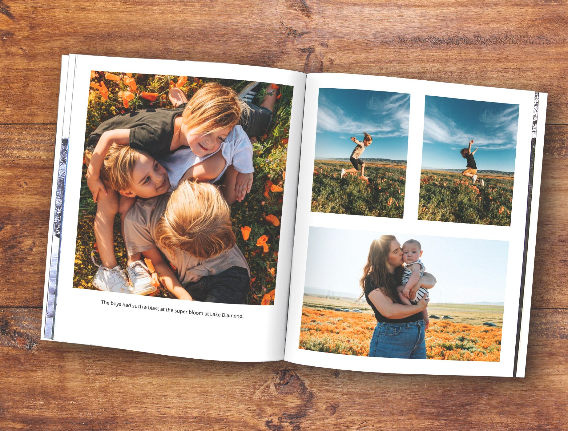 Choose a different layout for each page. Resize pictures, change background color, and add captions to your liking.