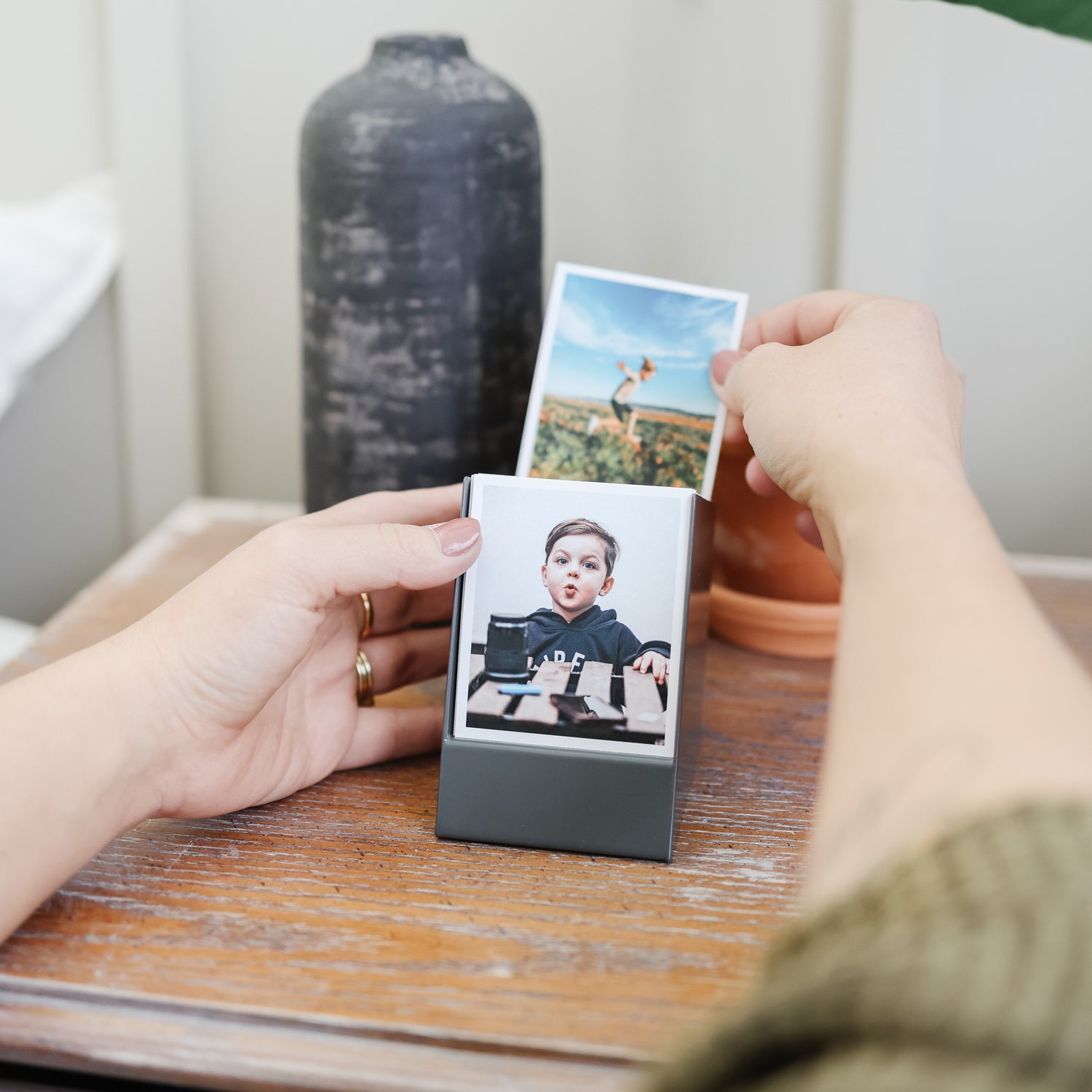 The larger stand is perfect for 4x4, 5x5, 4x6, and 5x7 prints. The smaller stand is good for Mini Photo Prints displayed in either portrait or landscape orientation. Both stands comfortably hold up to 48 prints.